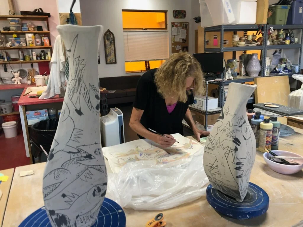 Alongside sculpture, I create vibrant, hand-built pottery that celebrates humor, imagination, and daily ritual. Whether it’s a jar topped with a mischievous dog or a vase alive with flamingos under the moon, these functional pieces bring art into everyday life. They remind us that joy and playfulness are as essential as contemplation and depth.